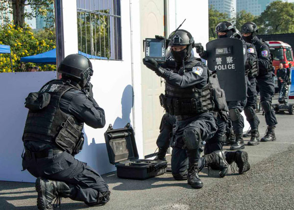 在過去的2016年粵警使出“洪荒之力”守護南粵平安,取得“颶風2016”專項行動戰果;中央政治局委員,廣東省委書記胡春華、廣東省公安廳廳長李春生、廣東省公安廳禁毒局局長鄧建偉等領導參展并現場觀摩機器人排爆展示、解救人質演練、緝毒犬搜毒等課目演練。