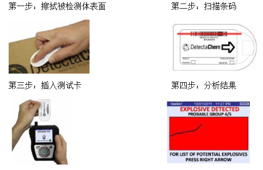 當(dāng)屏幕顯示綠色時,說明沒有爆炸物被檢測到;黃色屏幕說明可能會有爆炸物存在,建議用戶重新取樣并再次測試一遍;紅色表明檢測到爆炸物。Seeker會給出屏幕提示并進(jìn)一步告知細(xì)節(jié)。